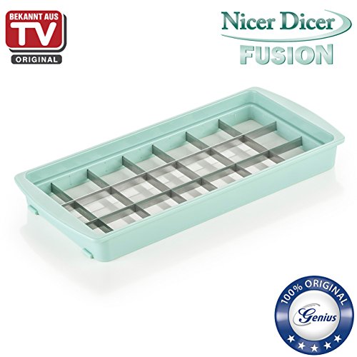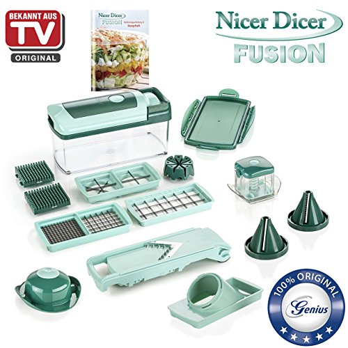 Chop your vegetables within seconds without hassle and mess! The Nicer Dicer Fusion multi-chopper set has everything you need for cutting, dicing, grating, and slicing! The set contains the following parts 1 x Cutting top 1 x Cutting base 1 x Blade insert (6 x 6 mm/12 x 12 mm) 1 x Pin block, small 1 x XXL blade insert (24 x 24 mm) 1 x Pin block, large 1 x Blade insert (quarters and eighths) 1 x Cutting stamp 1 x Nicer Slicer with blade protector 1 x Handy Hopper 1 x Food holder 1 x Collecting container (capacity: 2500 ml) 1 x Fresh-keeping lid 1 x Frame 1 x Spiral insert with smooth blade 1 x Spiral insert with Julietti blade Plagiarism and counterfeits are issues that concern all of us. Genius is steadily anxious in protecting our products against plagiarism and unfair competition. The quality of Genius Nicer Dicer Products is the key for our customer's satisfaction. Dull blades and poor quality material can lead to serious injuries. In order to avoid those matters, make sure that - you only buy from Genius. There are no other authorized sellers on amazon - receive your ordered product in our brown box with white label on it. We don't use any color packaging - find our valuable instruction manual inside - Check whether you have the original Genius Nicer Dicer product by looking at the interior plastic frame - and find our US Patent Number, which gives you assurance to be the owner of an original Genius product 0