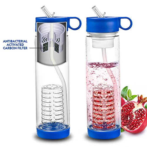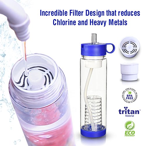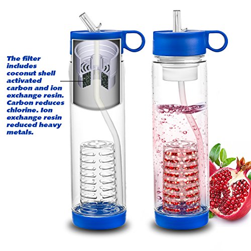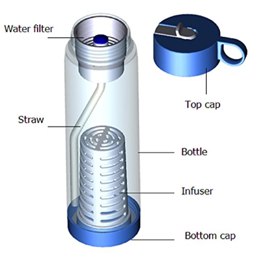 Studio : Basily Publisher : Basily Binding : Kitchen Product Description Do you hate the taste of tap water which smells of chlorine and metallic minerals? OrAre you bored of drinking the same plain water over and again and would rather prefer a naturally flavoured, vitamins rich purified water?We have designed an innovative product that not only filters water on the go but also provides a way to enjoy water infused with real fruits and vegetables - letting you have homemade nutrients rich beverages on the go.Filter / Infuser Water BottleThe innovative 2-in-1 water filter / infuser bottle is a unique design that brings the benefit of two useful products into one, which is the first of its kind ever. Now, you don’t have to worry about finding filtered clean water because you can filter water on the go with this bottle which has coconut shell activated carbon and ion exchange resin filter. Simply refill the water in the bottle, toss in your favorite fruits in the infuser section and enjoy the healthy, flavored drink. Enjoy Organic flavors instead of artificial flavorsWhy would you go for an artificially flavored drink when you can enjoy healthy infused drinking water with almost no effort. Infuse the organic and fresh fruits in pure water and get the taste of original flavours.Clean DesignThe reusable water bottle comes with removable water filter and infuser, so you can convert your fancy gadget into a regular water bottle, an infuser container, or a water filter. In addition, the detachable parts make it easy to clean each part thoroughly. The bottle is leak-proof and compact which makes it perfect for storing it in car cup holders, bike cages, and exercise machines.Keep yourself Hydrated all the time Do you always forget to drink water or are not a big fan of drinking plain water? Why do you want to take a chance with your health when you can drink safe and clean water using this innovative water bottle.Note** The water filter needs to be changed every 40 gallons or 2 months. 0