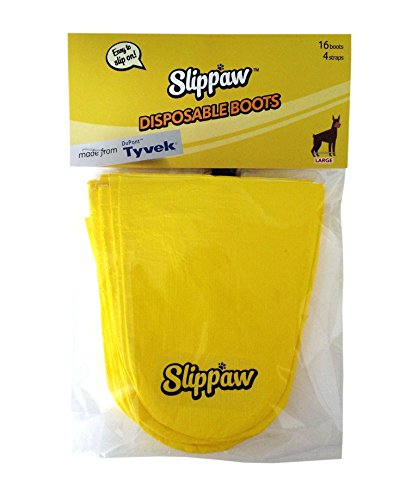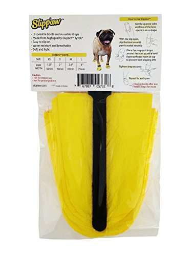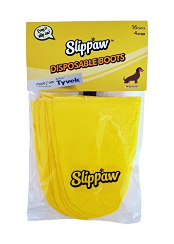 Each package contains 16 disposable boots and 4 reusable hook-and-loop straps. Slippaw comes in X-small, Small, Medium, and Large sizes.
