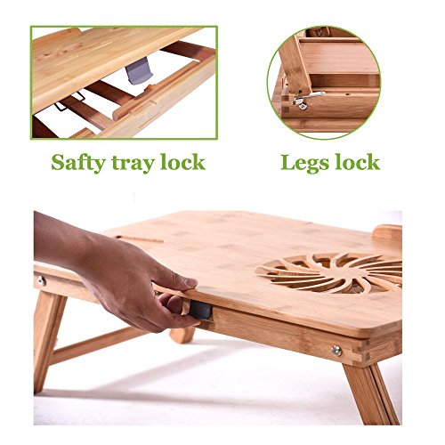 An integrated storage drawer is available to storage small piece. Foldable and extented legs for easy storage. A safe lock design can keep the desk more stable.