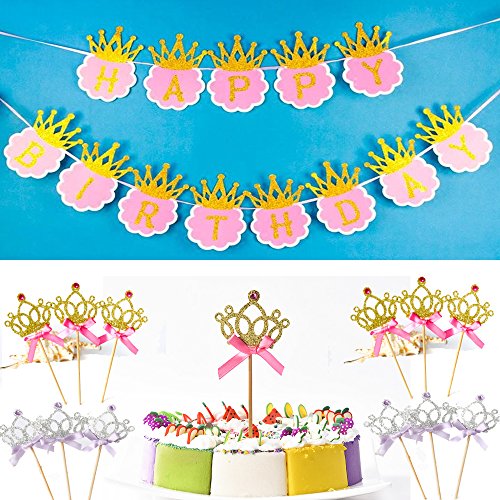 - Product include:Pink and gold crown banner comes in 2 pieces.6pcs pink gold cupcake topper and 6pcs silvery cupcake topper