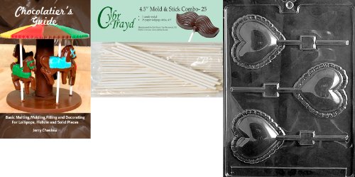 Cybrtrayd 'Large Lace Heart Lolly' Valentine Chocolate Candy Mold with 25 4.5-Inch Lollipop Sticks and Chocolatier's Guide