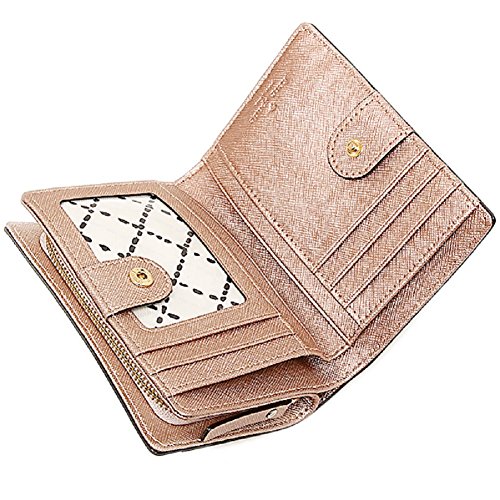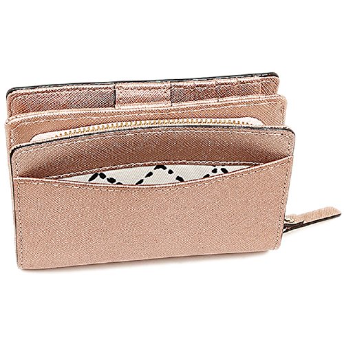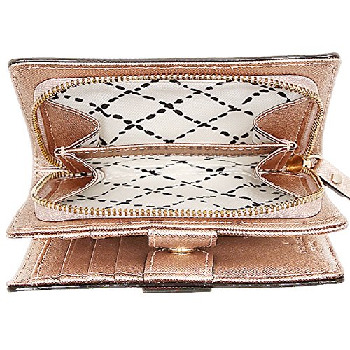 Saffiano Leather. Snap and zipper closure. Slip pocket on back. Interior with 4 card slots, 4 multifunction slots, clear ID slot and and full length bill compartment. Zip around portion with 2 accordion style openings. Measures approximately 5" (L) x 3.75" (H) x 1.5" (W)Feature