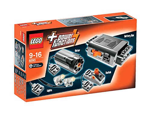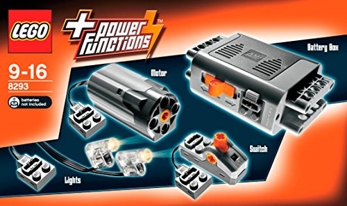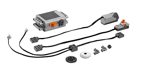 Power Functions motor set includes a M-Motor, battery box, light cable, pole switch and additional pieces to add new functions and features to your motorized models.