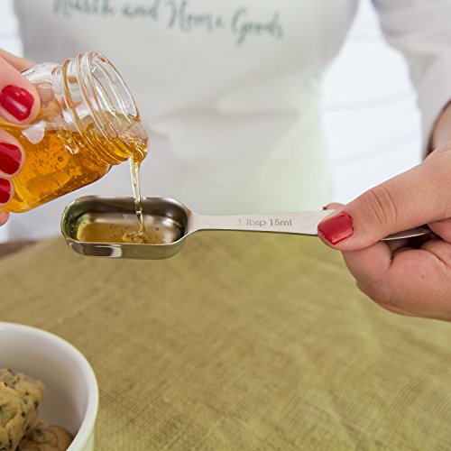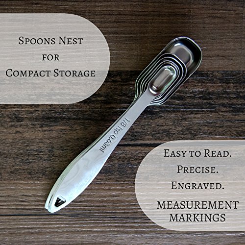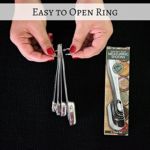 -. Feature : EASILY FITS IN SPICE JAR: The rectangular shape allows you to insert the spoon into spice jars which will prevent waste of your spices and a mess in your kitchen. Our long handled utensils have an elegant curve and fit comfortably in your hand making it easier to hold and reach into the jars. / EASY TO READ, ENGRAVED MEASUREMENT MARKINGS THAT WON'T RUB OFF: Unlike plastic measuring spoons that eventually lose their markings, these measurements will not rub or wash off in your dishwasher! The measurements on our spoons are engraved with both english and metric units for accurate measuring with every use. This 6 piece set has the following etched on the spoon's handle: 1 Tbsp 15ml · 1 tsp 5ml · 3/4 tsp 3.75 ml · 1/2 tsp 2.5 ml · 1/4 tsp 1.25 ml and 1/8 tsp 0.63 ml. / HEAVY DUTY AND MADE TO LAST: Our polished stainless steel spoons are one solid, durable piece. No welded parts here! Making them the best choice - whether they are used for prep, cooking and baking at home or for constant use by a professional chef working in a commercial restaurant. They are dishwasher safe, so clean up is easy and they are rust free. These useful tools are beautifully packaged and make a great gift for weddings, birthdays, housewarmings or anyone that loves to bake or cook! / GREAT ACCESSORY FOR YOUR KITCHEN PANTRY OR BAKING STATION: Our beautiful measuring spoons have a silver ring holder - perfect for hanging on your wall to allow quick access. Or place them in a drawer, their narrow design gives them a nesting capability for compact storage. The ring is easy to open so you can use the spoons individually if you want. / ENJOY COOKING WITH OUR HIGH QUALITY SPOONS OR YOUR MONEY BACK! Our customers are very important to us. We offer a lifetime guarantee. If you are not completely satisfied with your purchase, just let us know and we will give you a full refund. Take advantage of this risk free guarantee today!