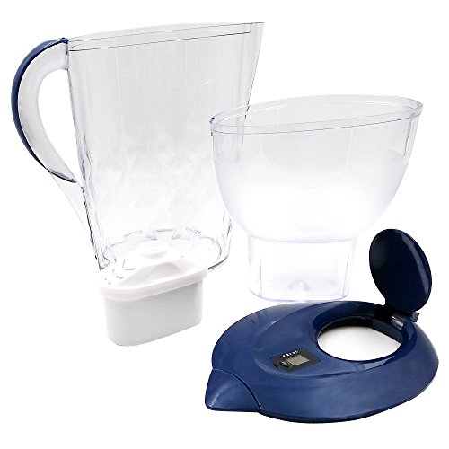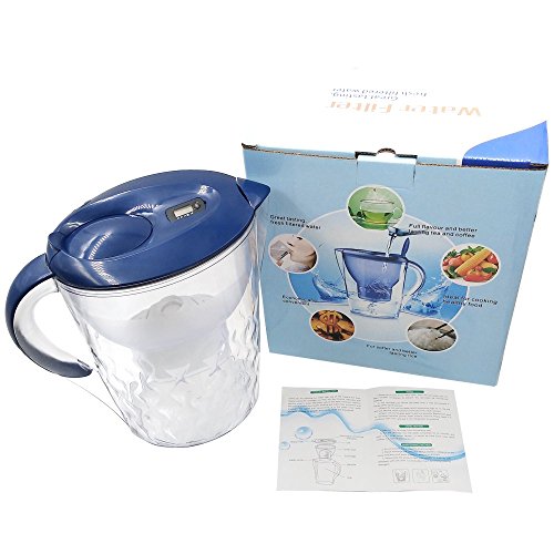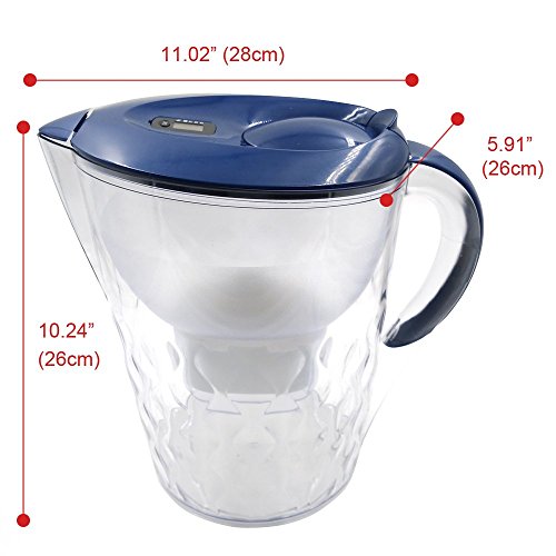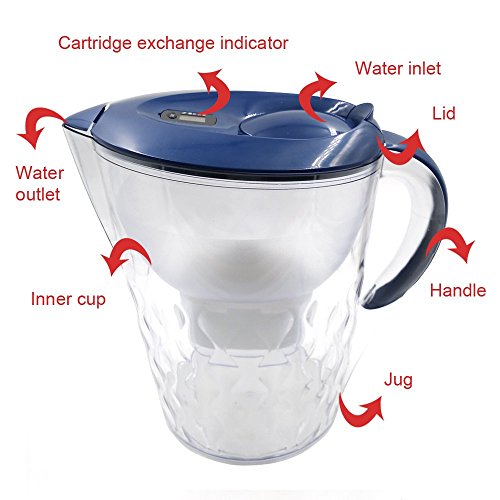 -. Feature : Food-grade ABS material adopted, safe and secure for both home and office use / Effectively filtrate sand, iron rust, sludge, bacteria, chlorine, impurities and peculiar smell, organic matter and other harmful substance in water / Classic oval design to maximize refrigerator space / Non-slip and soft-grip handle for easy pouring & removable lid for quick re-filling / The time on the cover of jug helps you remember the using time of cartridge and remind you to exchange the cartridge in time, ensuring the purification ability of the jug