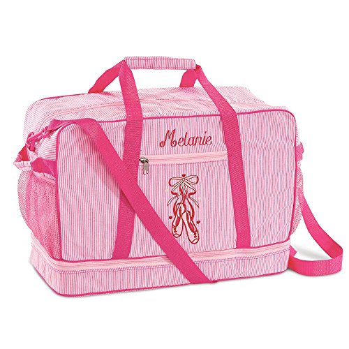 -. Feature : Lillian Vernon Exclusive. / These bags are always on pointe! Striped ballet bags hold everything your dancing star needs - slippers, costumes, and more! Bottom zippered section separates shoes from clothes. / 100% cotton with fabric lining and stay-dry interlining to protect from rain. Pretty ballet-slippers embroidered applique on front; adjustable shoulder strap and 2 padded handles. / 19" Medium 9" x 13" x 19" W / Specify block or script (all CAPS are not recommended for script font only) and name up to 12 characters.