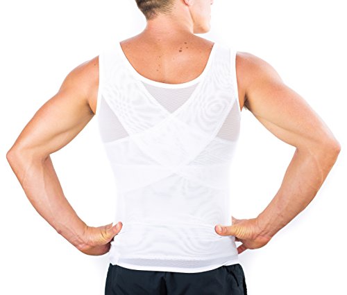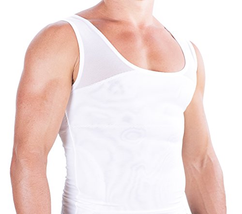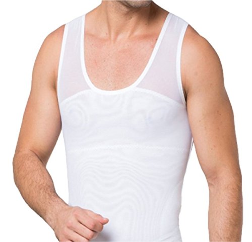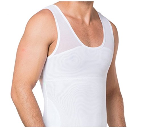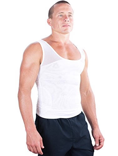This is a perfectly fitted, soft to the skin, mens slimming compression undershirt that stretches and recoils as your body moves. On the inside are powerful layers of Polyester & Spandex tightly knitted together flattening your chest and stomach. This garment is designed for men suffering from Gynecomastia. Made for wearing underneath any kind of clothing, such as workout shirts, t-shirts, sweaters and formal dress shirts. The compression is a secret between you and your garment. Get your self-esteem back! A chest flattening breakthrough! This is an excellent Gynecomastia or "man boobs" compression shirt for the man who wants to enjoy a healthy looking figure without the need for surgery or medications.