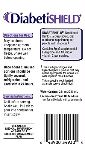 -. Feature : Diabetishield Nutritional Drink is a clear liquid supplement for people with diabetes on a clear liquid diet. / Made with a unique blend of ingredients that provides a good source of protein, vitamin C and supplemental arginine** (**This is a high-nitrogen and high-phosphorus product that may not be approP.R.Iate for individuals with impaired renal function). / Available in Mixed Berry flavor / Suitable for fat-free, low-residue, gluten-free, kosher and lactose-free diets* (*Not for individuals with galactosemia) Not for IV use. Diabetishield is not a total feeding. USE UNDER MEDICAL SUPERVISION AS PART OF A DIABETES MANAGEMENT PLAN / Questions? We've got Expert Answers, Guidance & Support! Call Nestle Info Link @ 1-800-422-2752 or visit the Nestlé Health Science website for more info!