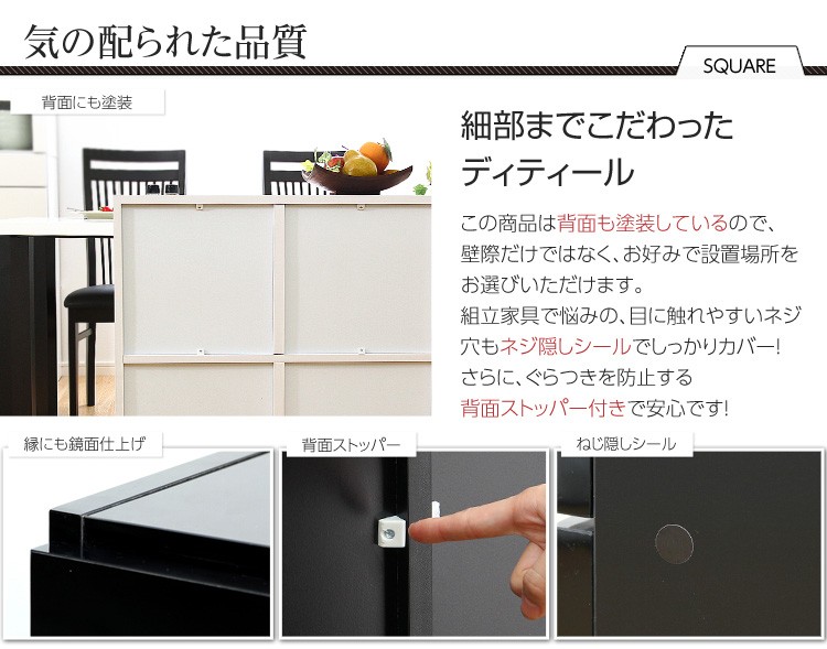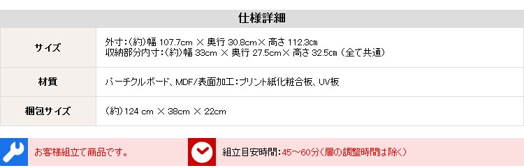 ※メーカー直送のため代金引換はお受けできません。※こちらの商品は、北海道・沖縄・離島へのお届けはお受けしておりません。[カラー]ホワイト、ブラック[サイズ]■外寸:幅107.7×奥行30.8×高さ112.3cm■収納部分内寸:幅33×奥行27.5×高さ32.5cm(全て共通)■材質:パーチクルボード、MDF/表面加工:プリント紙化粧合板、UV板■梱包重量:40kg■その他:お客様による組立品です。