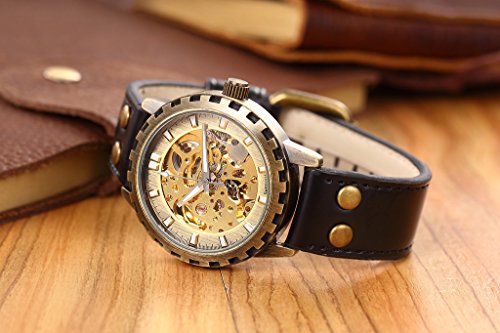 -. Feature : GuTe-picked Retro Steampunk Mechanical Watch Unisex Style / Retro Brass Watch Case / Skeleton See throught Watch Dial with Luminous Automatic / Gear Bezel, Black PU Strap with Brass Buckle / GuTe Minimalist Kraft Watchbox ECO-friendly Packaging for You