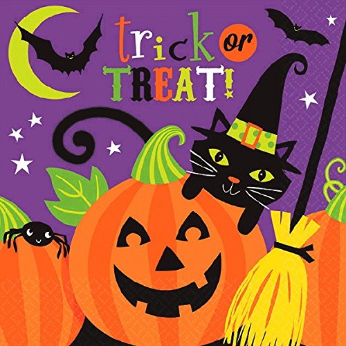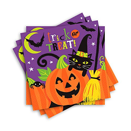 - Halloween napkins feature a black cat, broomstick, smiling jack-o'-lanterns, and more. "Trick or Treat" is printed across the top against a purple background.