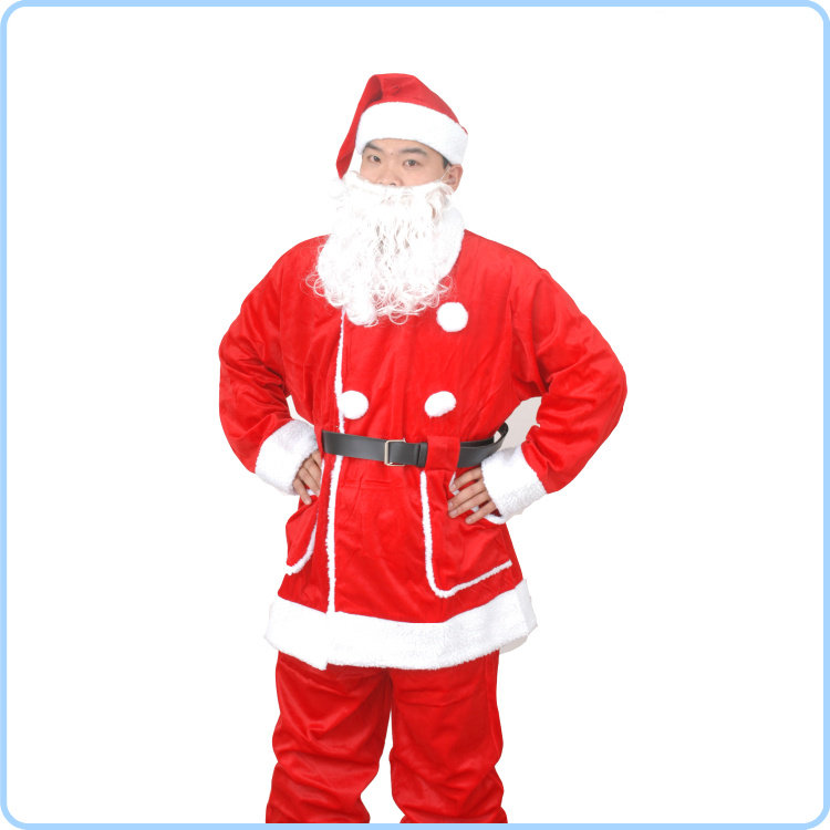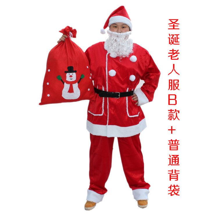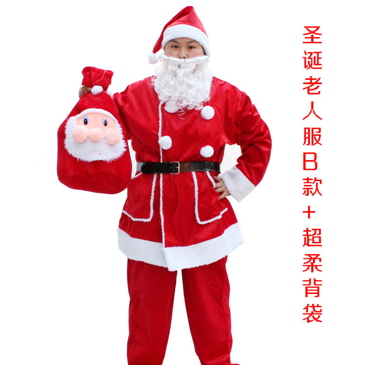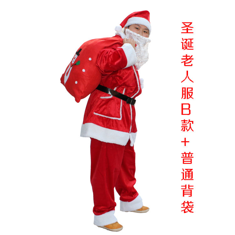 Christmas service B section including a jacket, pants one, a hat, a beard, a 500-like belt. Christmas backpack there are two materials: Non-woven and thick velvet, woven bags pattern above a variety of random hair oh