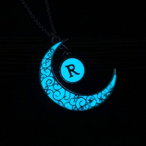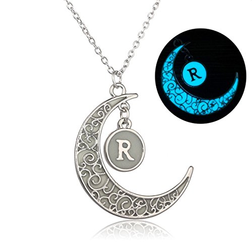 -. Title : Linsh Initial Necklace Glow in Dark Hollow Out Carved Moon R Letter Pendant Necklace Color: Silver