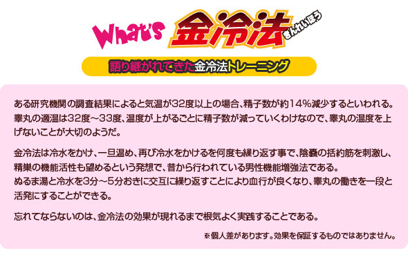 金冷法というのは読んで字のごとく、金の玉(タマタマ=睾丸)を冷やす事 によって精力を強化するというものなんだね。