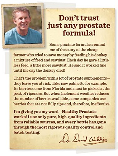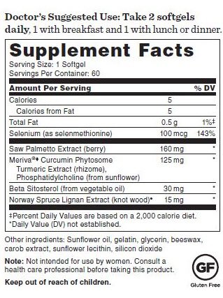 SOY FREE FORMULA - GLUTEN FREE FORMULA! Dr. David Williams Healthy Prostate formula supports all aspects of healthy prostate function and urinary tract health with a combination of five key ingredients. Healthy Prostate gives you beta sitosterol and saw palmetto which help support healthy prostate size and promote urine flow. In a randomized, placebo-controlled, double-blind trial, participants who were given 20 mg of beta sitosterol 3 times a day had better urine flow. This means they could more completely relieve their bladders-so they didn't feel like they still had to go. Better yet, 18 months later in a follow-up trial, they found that the benefits were still working. And Saw Palmetto helps inhibit the conversion of the hormone testosterone to dihydrotestosterone (DHT). Normal DHT levels help maintain a healthy prostate and improve urination. Plus, Meriva turmeric extract is more bioavailable than ordinary curcumin so it gets into your cells easier than other sources to target inflammatory markers. Rounding out the formula is HMRlignan and selenium which offer a range of overall health benefits including antioxidant and immune support. Altogether, these five ingredients work together to provide you with an effective, comprehensive solution for advanced prostate support.Feature