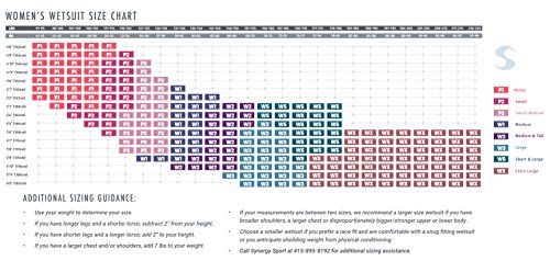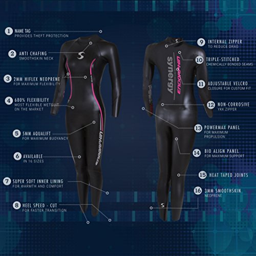 -. Feature : 5mm thick chest to knees Buoyancy panel / 3mm lower legs and back / 2mm arms and shoulders. Super soft low neck with smooth skin on both sides and because it is so soft, it feels like you hardly have anything around your neck. / Neoprene made from Yamamoto #39 and #40 with SCS silicone coated SyPrene. / Unsurpassed 680 percent flexibility. The zipper is the highest grade anti corrode wetsuit zipper from YKK. It is an internal zipper, which means that it greatly reduces drag as you move through the water. / The Synergy Endorphin comes in 16 sizes to insure a perfect fit. All Synergy suits are approved by Ironman, ITU, USAT and FINA. / 30-Day Swim Test: If you are not 100% satisfied after swimming in this suit for 30-days, send it back for a full refund / 2 Year Warranty / Lifetime Replacement Guarantee.