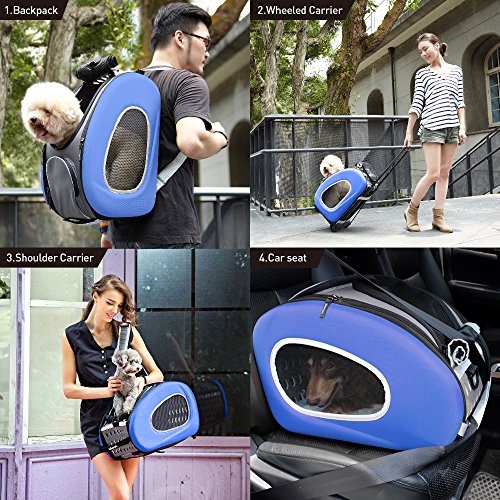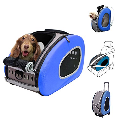 Studio : ibiyaya Publisher : ibiyaya Binding : Misc. Product Description IBIYAYA's Signature Multi-Function Carrier of all time. One item fulfills all your needs; you only need to buy this one and forget the rest.?? Multi-function 5 in 1 Package, could be used as; ?1. Shoulder carrier, ? 2. Backpack, ? 3. Pet Carrier Stroller, ?4. Pet car seat,? 5. Carrier with wheels. Whereas 4 in 1 Package, could be used as; 1. Shoulder carrier, ?2. Backpack, ?3. Pet car seat,? 4. Carrier with wheels. ??The EVA material has passed stress-crack test, which means the material does not crack. It has also passed SGS quality test, you can be sure that it does not have the chemical odor smell. This carrier will offer your fur baby a cozy motorhome.?? ◆ Multifunction? ◆ Space saving design, easy storage and transportation.? ◆ Eco Friendly material (EVA)? ◆ "Locking zippers" to prevent accidental escapes.? ◆ Carrier has one large side zipper pocket.? ◆ 360 degree swivel front wheels?and rear safety brakes.? ◆ Pet Stroller comes with One-Hand-Fold mechanism? ◆ Pet Stroller comes with Snack Tray with Dual Cup Holders.? ◆ Patented Product.?? Recommended Weight Limit: 18 lbs? N.W.: Carrier 4 lbs / Folding Cart 2.6lbs / Stroller frame 9lbs ?Carriage Dimensions: L20 W12 H13.5 (in)? Stroller Dimensions: L36 W37.4 H19 (in)? Stroller After Fold Dimensions: L19 W12 H32 (in)? Accessories: Removable pad with diaper sheet attach function design/ Shoulder Strap / Safety tether X1?? This carrier is NOT designed for airline use. Please do not choose your carrier based on weight - please reference your pet's length and height to make sure the size fits.?