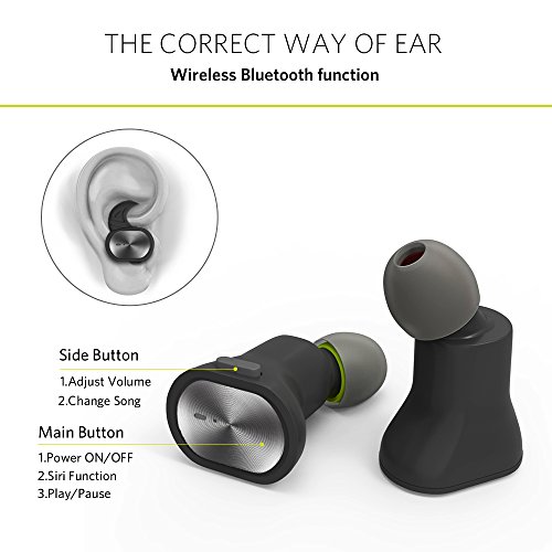 -. Feature : 1. EASY TO USE -- After pairing for the first time, power on: Just press the main button for the two headphones about 3 seconds, power off: Only press the main button for anyone earbud about 3 seconds; Compatible with your iPhone, Samsung Galaxy, Windows phone, iPad mini, and Alienware laptop. Please feel free to use! / 2. LONG BATTERY LIFE & CAN BE USED TO SEPARATE -- 5 hours continuous talk or music time, 200 hours of standby. 2 piece wireless earbuds, also you can use one earpiece, and put another headset on charge or share with others. / 3. SPORT BLUETOOTH HEADPHONES -- A light, sweatproof designed, packaging include 3 x Eartips(S,M,L) & 3 x Earhooks(S,M,L), making this mini wireless bluetooth earpiece perfect for the gym, running, biking, hiking, exercising, and any other workout . / 4. Bluetooth 4.1 + EDR -- Truly wireless stereo bluetooth headsets, good sound quality and good noise cancellation. These earbuds can be operated the calling (SIRI and GOOGLE NOW), volume/music settings; Great for calling in car, fishing, travel and any other outdoor or indoor activity. The favorite product for the Thanksgiving gift, Christmas gift, birthday present, etc. / 5. Warranty -- Reliable and friendly customer service ready to respond within a 24 hour time frame. 30-Day Money Back Guarantee.