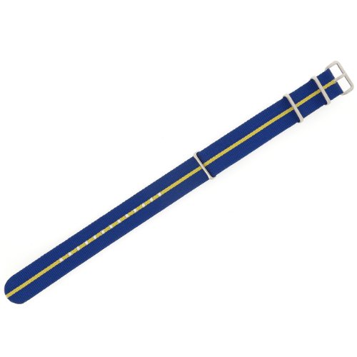 -. Feature : NATO type Blue & Yellow 20mm Nylon strap with solid polished stainless steel buckle and keepers / Material: cross weaved nylon 1.0mm thick / Laser treated holes with smooth finish / Adaptable Wrist Size: 14.5cm to 22.0cm / Length(end to end) 29.0cm (regular length)