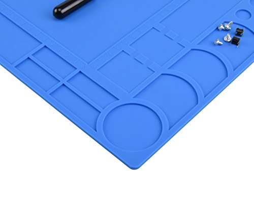- DESIGNED BY FIXERS: To make your repair work easily,the soldering mat was engraved L-shaped square ruler 23x18cm(9.05"x7.08"),19 different component grids on top and right side of mat to classify screws, IC chips and small parts, which improve your repair work efficiency,make maintenance platform neater, well organized and well protected.