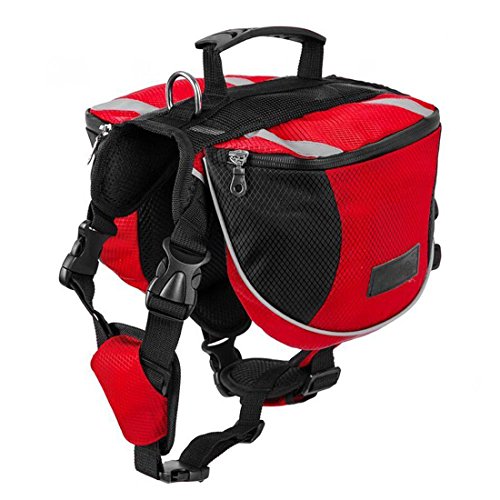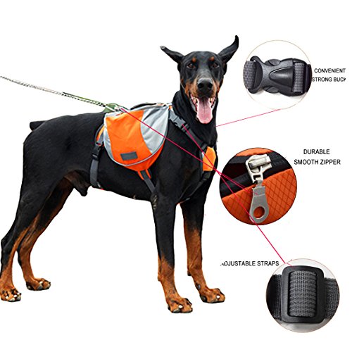 -. Feature : Multi-functional dog backpack,ideal for dog hiking,camping,long trail walks,backpacking trips,traveling or everyday use. / Ensure load stability and weight distribution,removable bags:This Carrier Dog Backpack with load compression system ensure load stability and weight distribution. Please ensure your dog carries no more than 25% of their body weight in their dog pack. / Unique adjustable saddle bag construction enables adjustment to fit most dog sizes and proportions. / Reflective accents and bright colors for high visibility. / High density 600D Dxford Fabric provide a better holding for your beloved pet and do not hurt fur.Two main zipper side compartments with semi-open pockets for carrying dog food holder,water,snacks,wast disposal bags,etc.