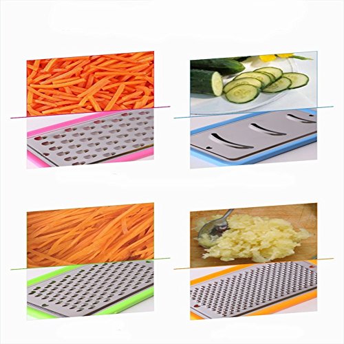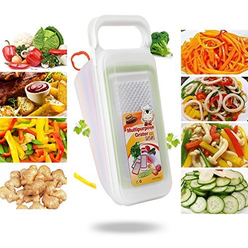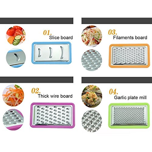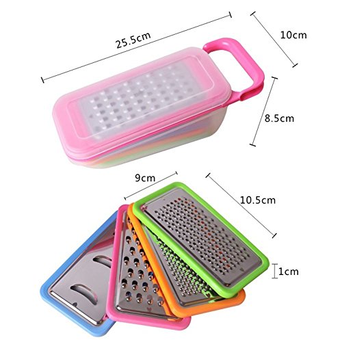 - 【4 Graters in 1】: 1) Coarse Shred 2) Medium Shred 3) Fine Shred / Zester 4) Slicer