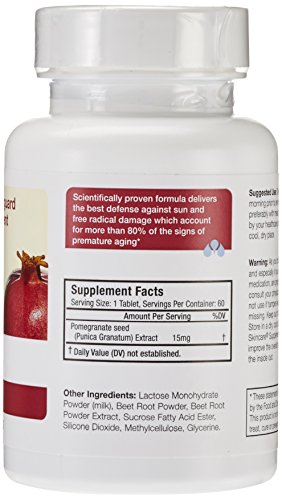 -. Binding : Health and Beauty -. Brand : Murad -. Department : womens -. EAN : 0767332400389 -. Feature : Increase sunscreen protection from the inside by 25% / Contains only the most powerful antioxidants / Clinically proven to increase the SPF of topical sunscreen / Contains Pomegranate Extract and Ellagic Acid / Prevents free radical damage -. IsAdultProduct : 0 -. Label : Murad -. LegalDisclaimer : This product can only be shipped to the following countries: United States, Canada -. Manufacturer : Murad -. Model : 40038 -. MPN : 40038 -. NumberOfItems : 1 -. PackageQuantity : 1 -. PartNumber : 40038 -. ProductGroup : Health and Beauty -. ProductTypeName : HEALTH_PERSONAL_CARE -. Publisher : Murad -. ReleaseDate : 2015-06-22 -. Size : 60-Count -. Studio : Murad -. Title : Murad Pomphenol Sunguard Dietary Supplement, 100% Pure Pomegrante Extract, 60 Tablets -. UPC : 767332400389