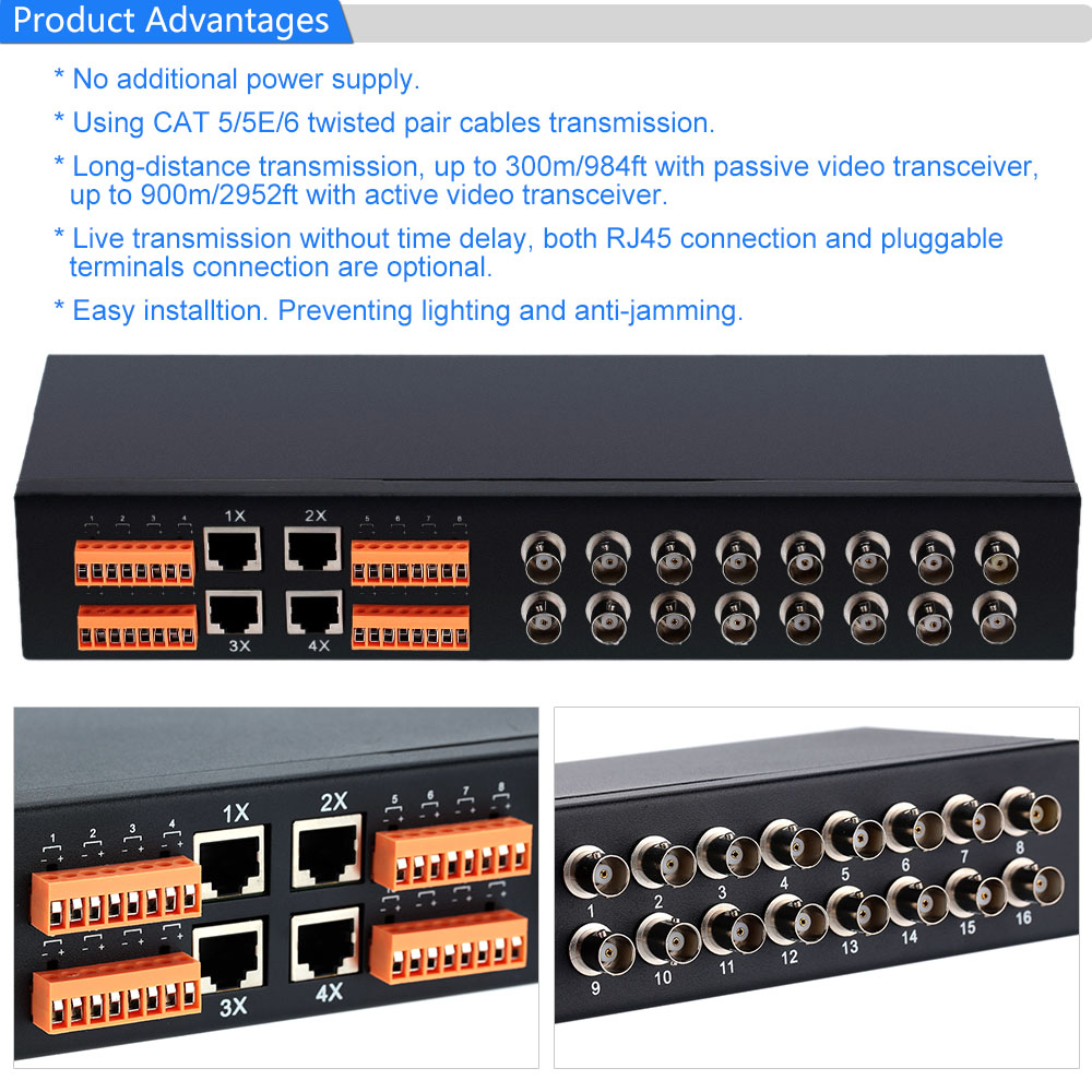 This 16 channel passive video transceiver without additional power supply uses 4 pairs twisted-pair cables to transmit 4 channel video picture signal. This equipment are compatible with PAL, NTSC and SECAM baseband Composite Video signals. It can be used as transmitter, can also be used as receiver(So this equipment can be used in pairs). Finally, you can use it with various other passive or active UTP Video Balun Transceivers. Small in size, easy for installation, it's nice to have.?