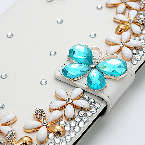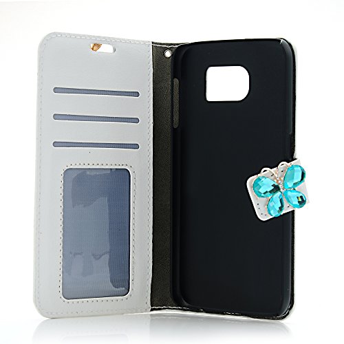 Galaxy S6 Case - Mavis's Diary 3D Handmade Bling Crystal Golden Flowers PU Leather Wallet with Lovely Sparkle Blue Diamond Butterfly Magnetic Clasp Flip Folio Case for Samsung Galaxy S6 (Combination)