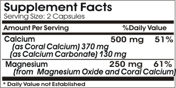 Coral Calcium Cal/Mag enhances bone, nerve and heart health, while Magnesium plays a role in the regulation of Calcium and protein formation.Two (2) capsules contain 500 mg Calcium and 250 mg Magnesium. DIRECTIONS: Take two (2) Calcium capsules two (2) times per day, preferably with meals, depending on your Calcium needs. Please, discuss the supplements and medications you take with your health care providers.