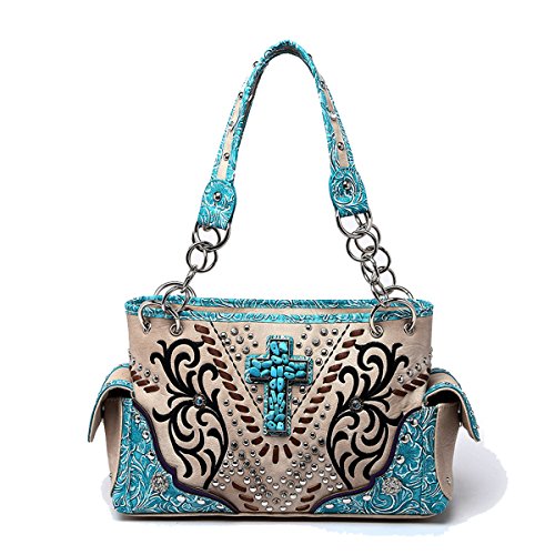 -. Title : Western Handbag - Multi Turquoise Stone Cross Stitch Embroidered Concealed Carry Shoulderbag with Stud and Rhinestone Accents