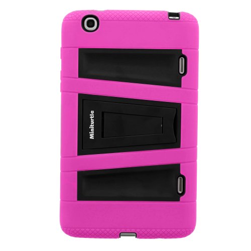 This 2 in 1 heavy duty rugged shell case is made up of two pieces; the inner casing is designed of polycarbonate to resist impact, while the outer casing is designed of silicone skin gel to absorb shocks. The case itself will fit snug onto your tablet, while protecting all exposed parts of the tablet. The inner casing also has an integrated kickstand for comfortable, convenient, hands-free media viewing, and while it is not in use, it can click back into the case.