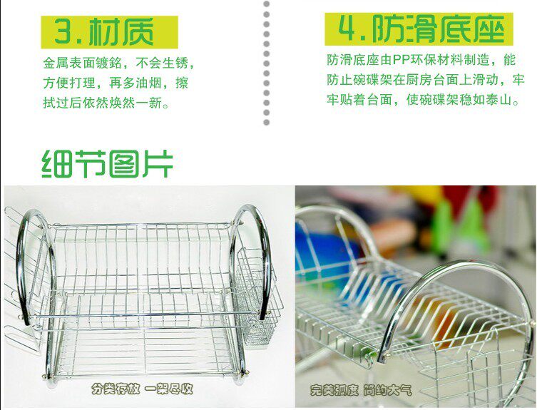 S字型圆管双层碗架,带筷筒,杯架,设计简约实用,彰显时尚家居品味。等离子涂镀工艺涂层,具有耐高温、抗磨损,不沾水等特点,耐久实用,历久如新。经过严格抗菌加工处理,用于厨房餐具收纳,是居家清洁环保的好帮手。超大存放空间,碗碟餐具一架尽收,清洁后滤水存放一步到位。上层可收纳16个餐盘和杯子,下层碗可倒扣后叠放。挂在碗架侧的筷筒和刀架可取下另放,使用灵活方便.