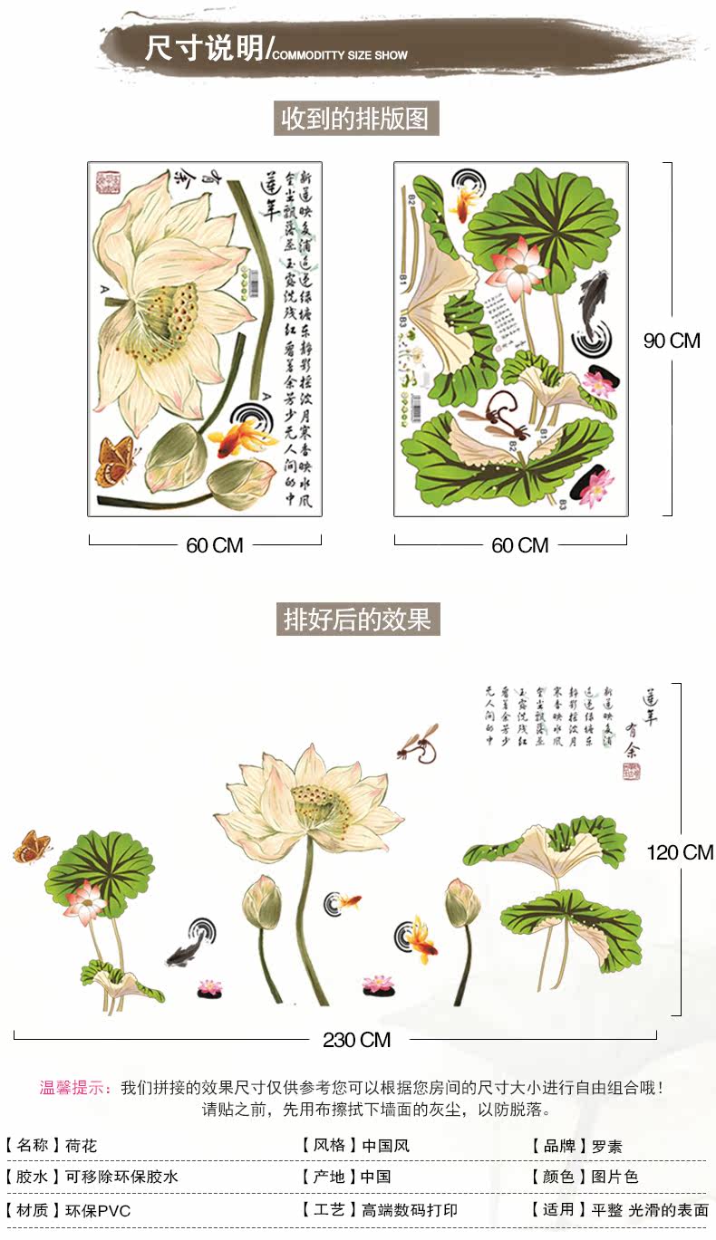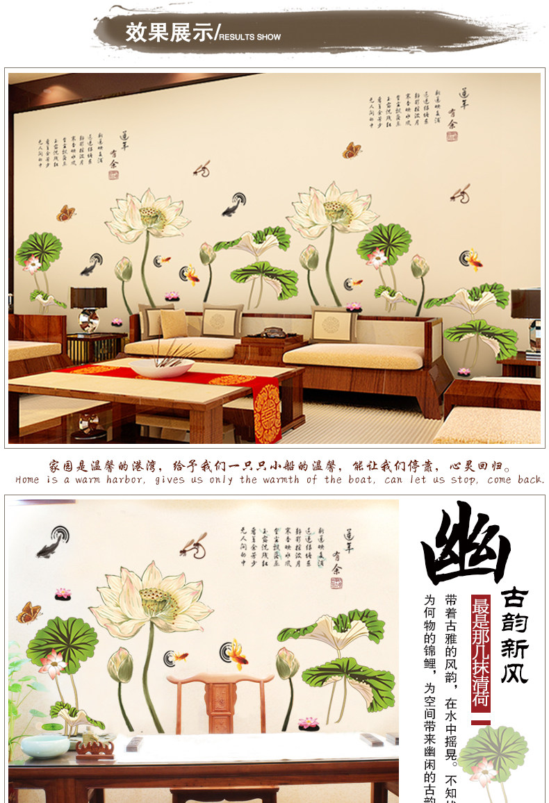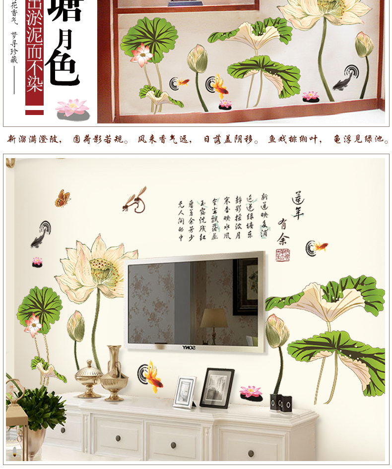 中国风古典莲花贴纸卧室客厅电视背景墙壁装饰可移除墙贴自粘贴画