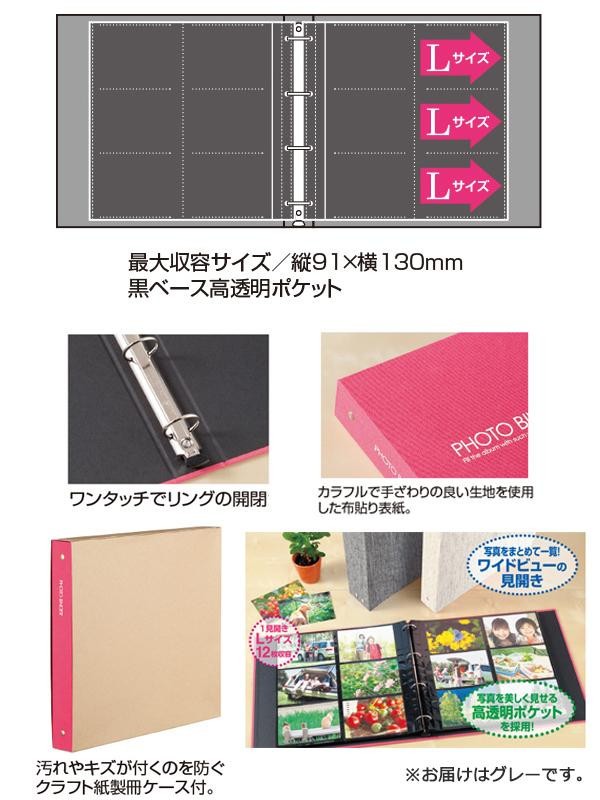 | 仕様 | 【収容枚数】 Lサイズ:600枚 最大収容サイズ:縦91×横130mm リングバインダー4穴 黒ベース高透明ポケット×50 2列3段(ヨコ入れ) |