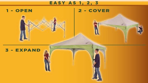 Amazon.com Whether you need a sun shelter for your tailgater or a moisture cover for your backyard BBQ, the Coleman 12-by-12 foot instant shelter is a perfect fit. The straight-leg shelter is sturdy and easy to set up, with a one-piece steel frame that's ready for use in only three minutes. More importantly, the Shelter gives you an instant 144 square feet of shade with a generous center height of 9 feet, eight inches. The Shelter sets up easily in only 3 minutes, with Coleman's exclusive push-button release levers--so your fingers are safe while setting up and taking down. And the shelter is as easy to take down as it is to put up, with Coleman's exclusive pushbutton release levers helping keep your fingers pinch-free. Made of heavy-duty 150-denier poly oxford material, the shelter is coated with an SPF 50-plus UV Guard protection for maximum sun safety. Features: - Sets up in less than 3 minutes