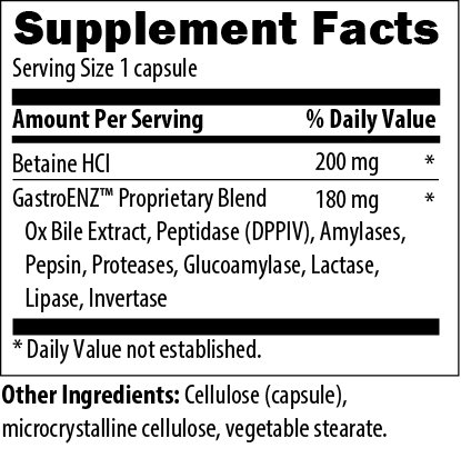 *These statements have not been evaluated by the Food and Drug Administration. This product is not intended to diagnose, treat, cure or prevent any disease. Details A combination of the most important enzymes for digestion of proteins, fats, and carbohydrates In order to assimilate vitamins and nutrients from our food and supplements, we must be able to digest them properly. Studies show that the foods in the typical American diet are devoid of natural enzymes and do little to help secrete our own production of enzymes. Thus, foods do not get digested well and nutrients from food are poorly absorbed. Poor digestive health can lead to various health disorders. Many health experts agree that regular consumption of enzymes and enzyme-rich foods is a key to vibrant health, disease prevention, and anti-aging. Every cell in the body needs enzymes for its biochemical functions, thus a deficiency will accelerate the aging process.