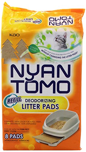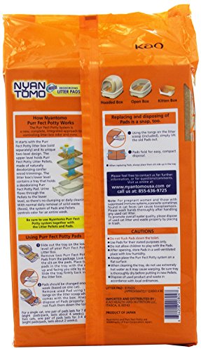 The upper level holds Purr Fect Potty Litter Pellets, made of conifer wood trimmings. The litter box‘s lower level contains a tray that holds a Purr Fect Potty Pad. Urine flows through the Pellets to the lower level, so there’s no clumping or daily cleaning. With normal daily removal of solid waste (feces), the system of Pads and Pellets controls odor for an entire week.