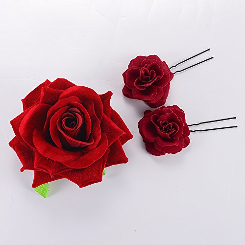 ClassicBeauty Elegant Bright Red Rose Velvet Hair Clip Set (1 Large 2 Small) New 2018 Flamenco Women and Girls Hair Accessories Wedding Bridesmaids Headpiece
