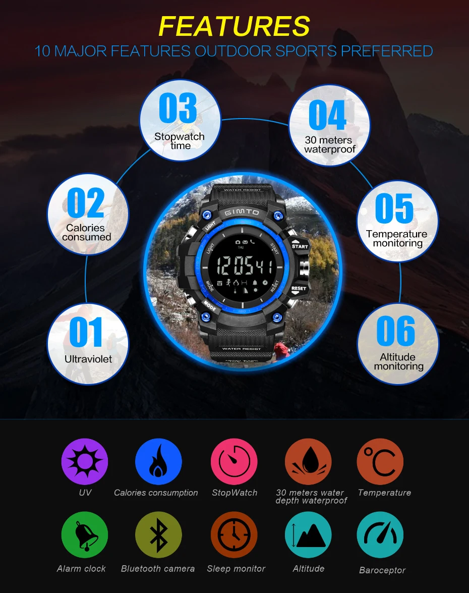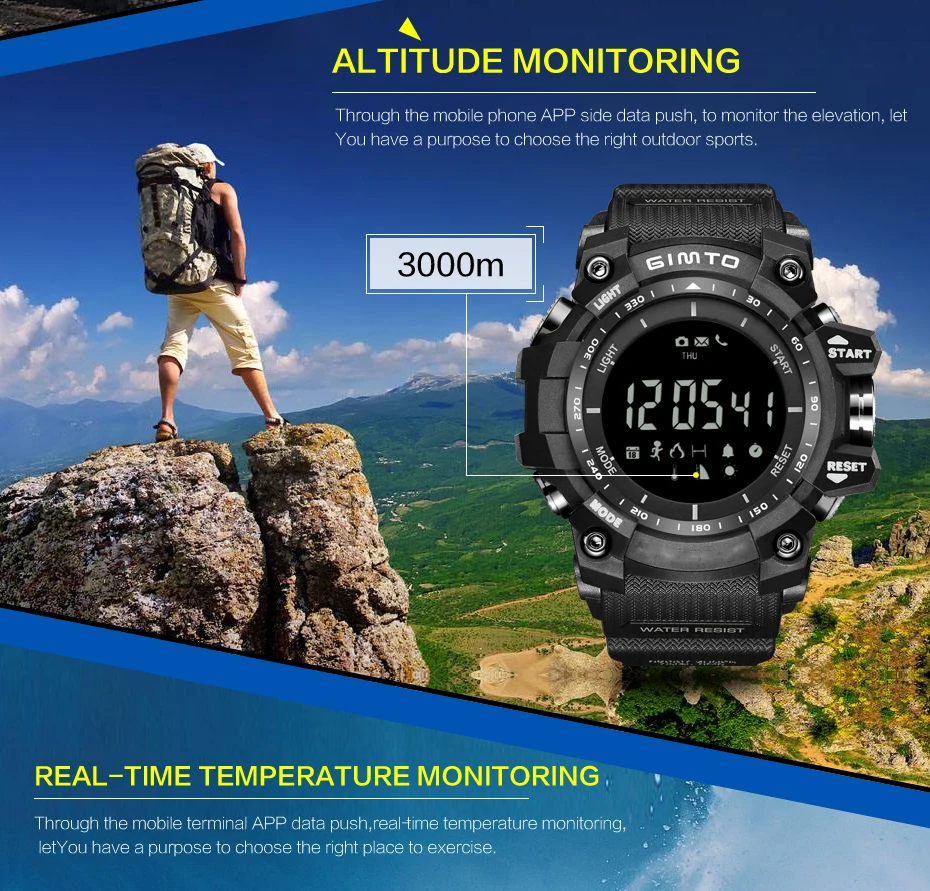 Feature:Back Light,Alarm,Water Resistant,Bluetooth,Shock Resistant,Temperature Measurement,Chronograph,Altimeter