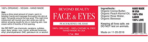 -. Feature : MADE FOR SENSITIVE SKIN - BEYOND BEAUTY Face and Eye Cream is specially formulated for those with skin sensitivities. Only the Best and Most high quality ingredients are used. / HAND MADE IN USA - This night time moisturizer will nourish your skin while you rest to deliver amazing results for dry or maturing skin. / 100% ORGANIC & VEGAN - Organic Cocoa Butter, Organic Peach Kernel Oil, Organic Rose Water, Organic Beeswax / NO ANIMAL TESTING - Keeping all lives safe, we DO NOT test on animals. / NO CHEMICALS - We DO NOT use chemicals, parabens, sulfates, dyes, dairy, gluten, corn, toxins, artificial fragrances, ethyl, phenoxyethanol, DAE, petroleum oil, or alcohol.