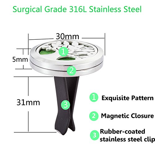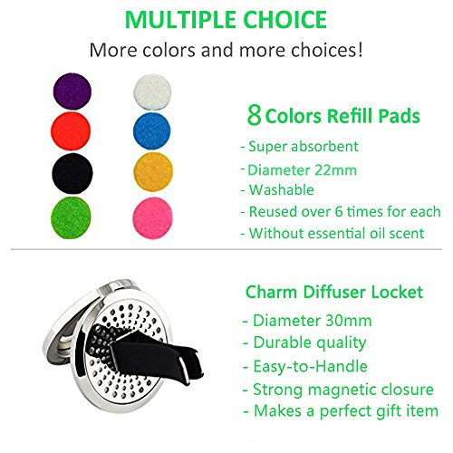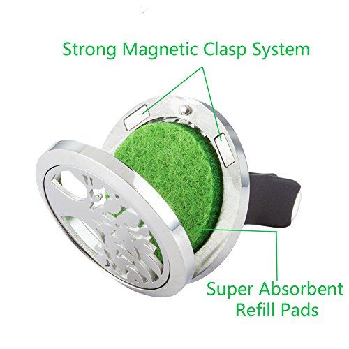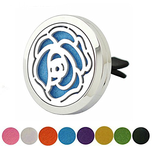 - Premium grade car air freshener aromatherapy essential oil diffuser vent locket jewelry with 8 color variants of reusable felt pads that releases a light aroma throughout your vehicle can be used as desired to complement your car’s interior design and fragrance.