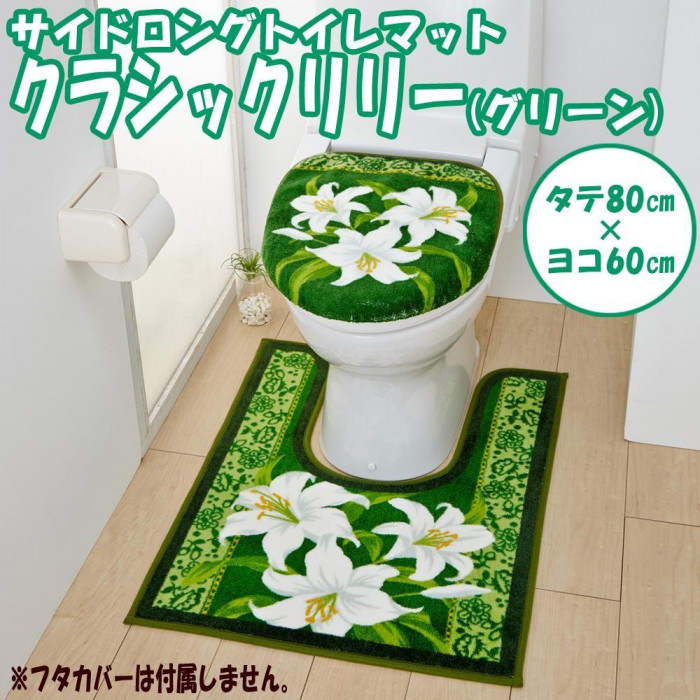 | 便器横の奥まで長いサイズのトイレマットです。裏面にすべりにくくするための加工を施しております。洗濯機で洗えますので、清潔にお使いいただけます。 |