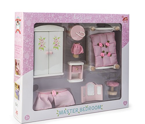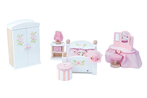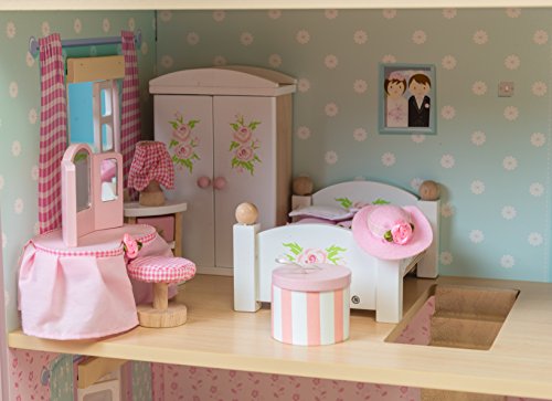 -. Feature : PART OF THE DOLLHOUSE COLLECTION - The Master Bedroom Set is part of the Dollhouse Furniture and Accessories. It is painted wooden furniture set with pink and green apple with the rose motif. / MIX AND MATCH - This Master bedroom is perfect to mix and match with the budkin dolls. With this Bedroom Set, kids have everything they need to give their doll the gorgeous bedroom they deserve. / COMPLETE SET - This set comes complete with various accessories ideal for Budkin dolls. It includes a double bed with rose-bud duvet & pillows, a wardrobe with hangers, dressing table, and a bedside table, a hat box and felt hat. / HIGH QUALITY - This furniture set is made from high quality wood, providing a durable set of fun accessories for the children to play with, helping them to develop their coordination skills and explore lots of role-play adventures. Your little ones will be completely immersed in the magical world of miniature home living. / PRODUCT DESCRIPTION - Perfectly scaled for all Le Toy Van doll's houses, all accessories included as pictured. This furniture will develop the creativity of your children and recommended for kids 3 years and older.
