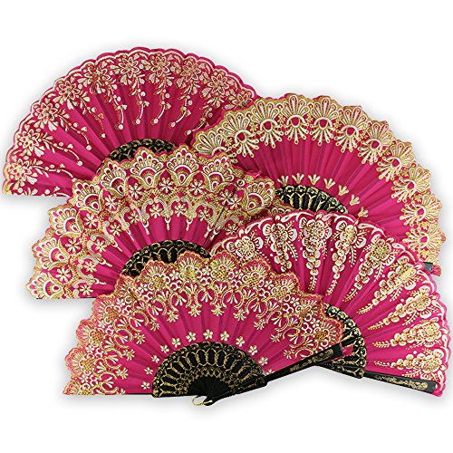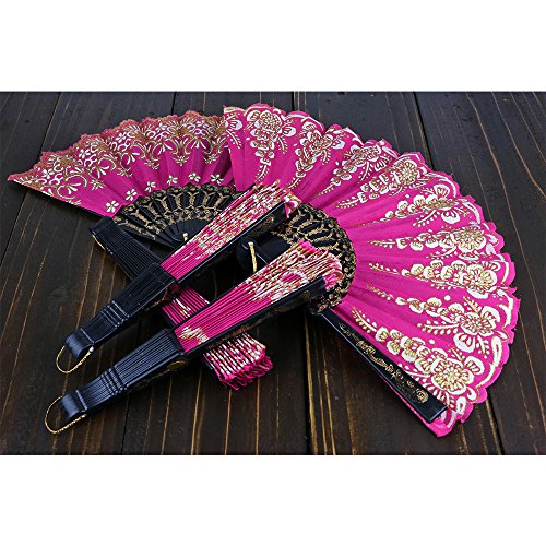 Just Artifacts 9” Glitter Flower Pattern Silk Hand Fans (Set of 5, Fuchsia w/ Gold & Black)