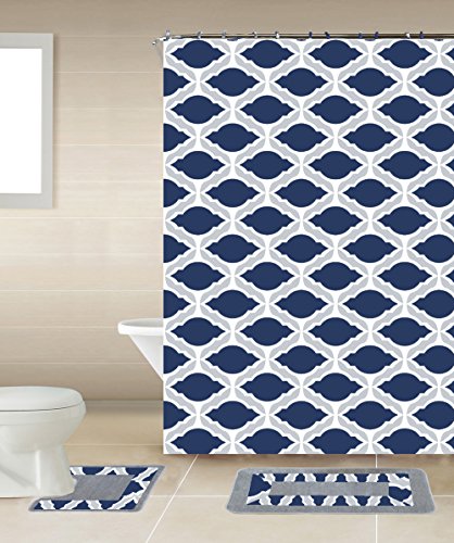 -. Title : Thea Navy Blue & Gray Chain 15-Piece Bathroom Accessory Set: 2 Bath Mats, Shower Curtain & 12 Fabric Covered Rings