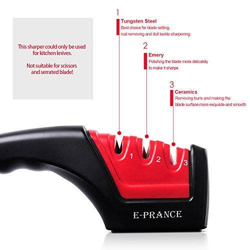 E-PRANCE Knife Sharpener, 3-Stage Manual Kitchen Knife Sharpener for Steel Knives, Safety Ergonomic Handle & Nonslip Silicone Base