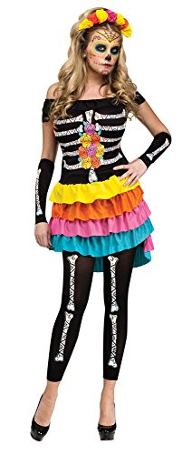-. Binding : Apparel -. Brand : Fun World -. Color : Multicoloured -. Department : womens -. Feature : Includes dress, sleevelets, footless tights, and headband. -. Genre : Holiday - Day of the Dead -. Label : FunWorld -. Manufacturer : FunWorld -. MPN : fu140093 -. PackageQuantity : 1 -. PartNumber : fu140093 -. ProductGroup : Apparel -. ProductTypeName : ADULT_COSTUME -. Publisher : FunWorld -. Studio : FunWorld -. Title : Fun World Costumes Women's Dia De Los Muertos Adult Costume