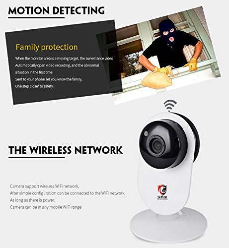 -. Feature : 1.Support wireless WIFI network connection,easliy start to communicate to family, the corner of shopping anywhere. Use one million HD 720P/960P/1080P video processing ,with 2 million 1080P HD lens. / 2. Support APP on mobile phone client, focused CMS client on PC. Intelligent oo-line,a key to set up a wireless connection convenient and quick. Support micro SD card record, up to 128GB. / 3. Support dynamic stream adjust, video file size can be changed along with the complexity of the scene,in order to save storage space. Supports Motion detection, Phone push, Email and Whistle alarm and mobile APP pushing. / 4. Support network synchronization,no longer worry about equipment time correction. Video format MP4 format,video files can pass through the storm,thunder ,Realplayer and other players directly open play. / 5. Supports two-way audio, Built-in Mic & Speaker and so on. Support video sharing. Support day and night monitoring,built-in double filter,IR-CUT switching mode,10 infrared night LED light. Support camera shaking function,turn around 355 degree,100 degress vertical. Support network and file promotion.